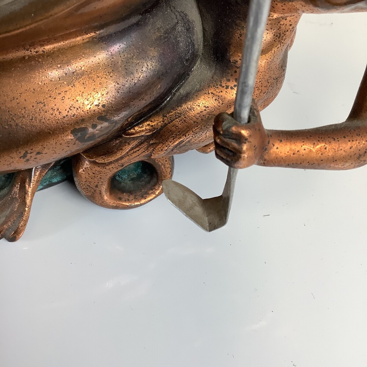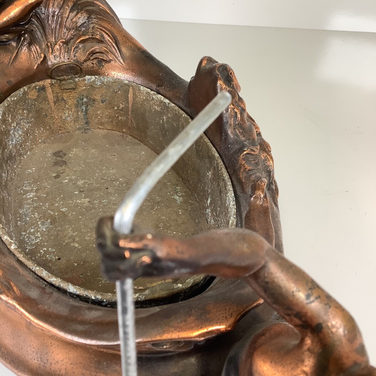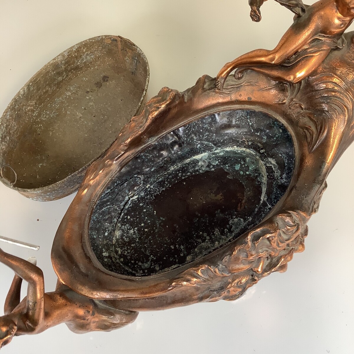 Very good antique condition with age-appropriate wear. The mermaid in back has what looks like a replacement oar made out of a gray metal. Overall atina appears original with expected surface variation. No obvious structural breaks noted. Please review all photos carefully as they form part of the description.