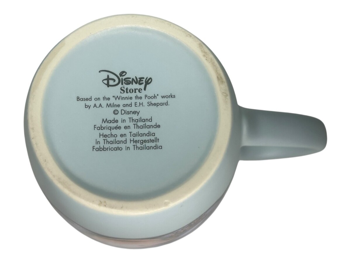 A charming ceramic mug that captures the melancholy yet endearing spirit of Eeyore from Winnie the Pooh, featuring the beloved character with a small bouquet of flowers, rendered in soft purple and mint green tones.
