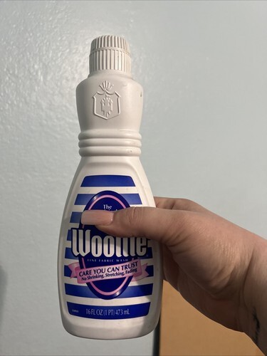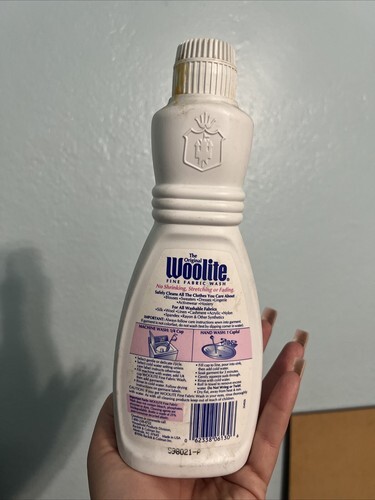 Vintage Original Woolite Fabric Wash Laundry 1990s 16 Fluid Ounces 50% Full bottle. The liquid is dark color. I?m not sure what color it?s supposed to be. Fill line is at the top of my thumb in the pictures. Great for movie prop or collectible bottle.