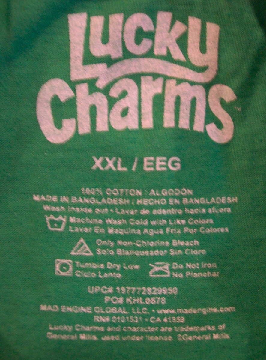 This is a VINTAGE STYLE LUCKY CHARMS CEREAL Leprechaun General Mills T-shirt. It is a size 2XL, and is NEW w/ TAG. It is 25 1/2 inches from armpit to armpit and 32 inches in length. Officially Licensed by General Mills. Combine auctions to save on shipping. AD