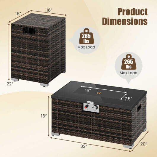 2-Piece Outdoor Rattan Fire Table Set 32 Inch Rectangle Gas Firepit with Tank Co