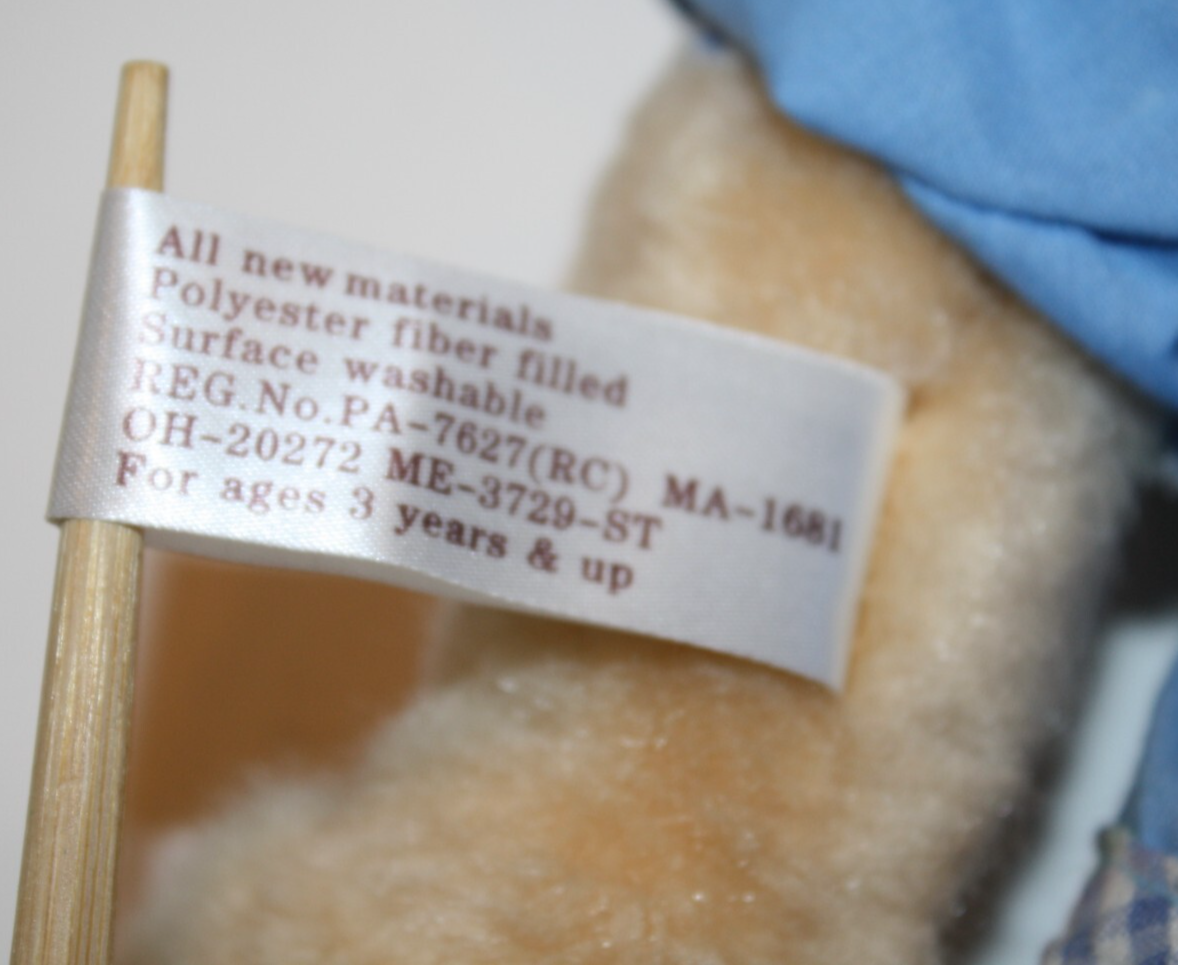 Close set Plastic Eyes, Pink Stitched Nose and Mouth, Blue Plaid Seersucker Bow Tie and Vest, Clothing is stitched to body, 5-way Jointed Arms, Legs and Neck, Stiffener in ears so you can pose as needed, Seam tag intact