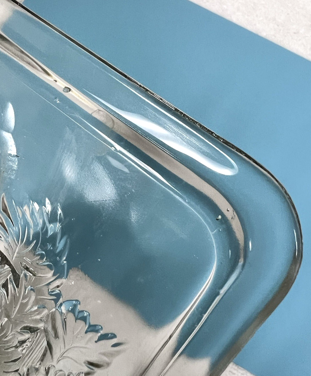Vintage Crystal Glass Pressed Indented Vegetables Refrigerator Dish Lid Only. Rectangular shaped refrigerator dish lid measures approx. 873/8" long and 4 3/4" wide, inside underneath of lid has the pressed indented vegetables... radishes celery tomato. Couple of small nicks inside rim edge, some roughness likely during production outside edge, good used condition. See pictures.