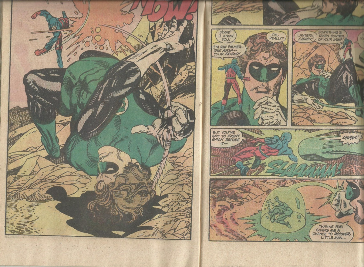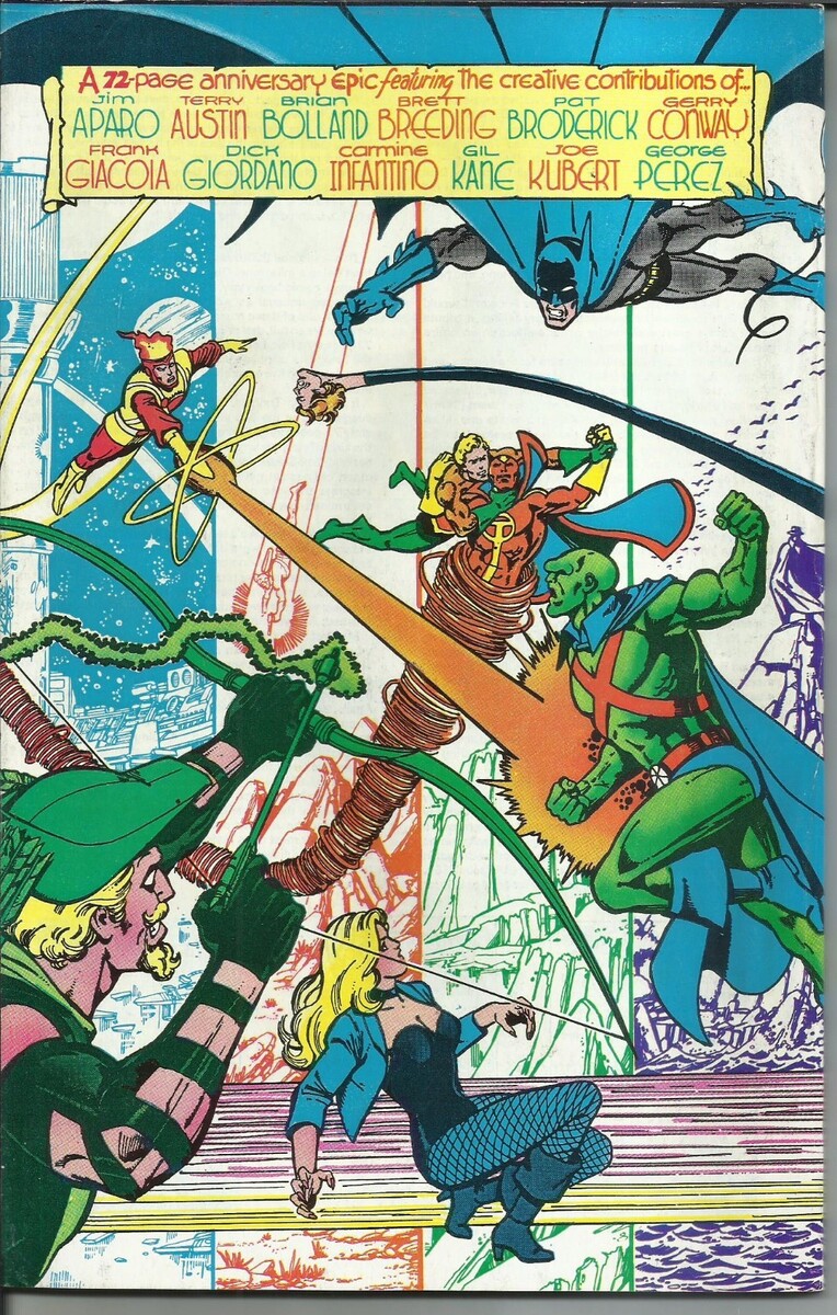 *Direct Edition. "A League Divided" is written by Gerry Conway, with art by George Perez and Brett Breeding, with chapter art by Pat Broderick/Terry Austin, Jim Aparo, Dick Giordano, Gil Kane, Carmine Infantino/Frank Giacoia, Brian Bolland, and Joe Kubert. Characters: Martian Manhunter [J'onn J'onzz]; Aquaman; Wonder Woman [Earth-1]; Green Lantern [Hal Jordan]; Flash [Barry Allen]; Superman [Earth-1]; Batman [Earth-1]; Firestorm; Red Tornado; Hawkman [Katar Hol]; Zatanna; Black Canary; Atom [Ray Palmer]; Snapper Carr (all as the Justice League of America/JLA, origin recap); green kryptonite (flashback); Green Arrow [Earth-1] (guest star); Adam Strange (guest star); Phantom Stranger (guest star); Alanna (cameo); Rulers of Appellax (villains); green kryptonite. Wraparound cover by George Perez.