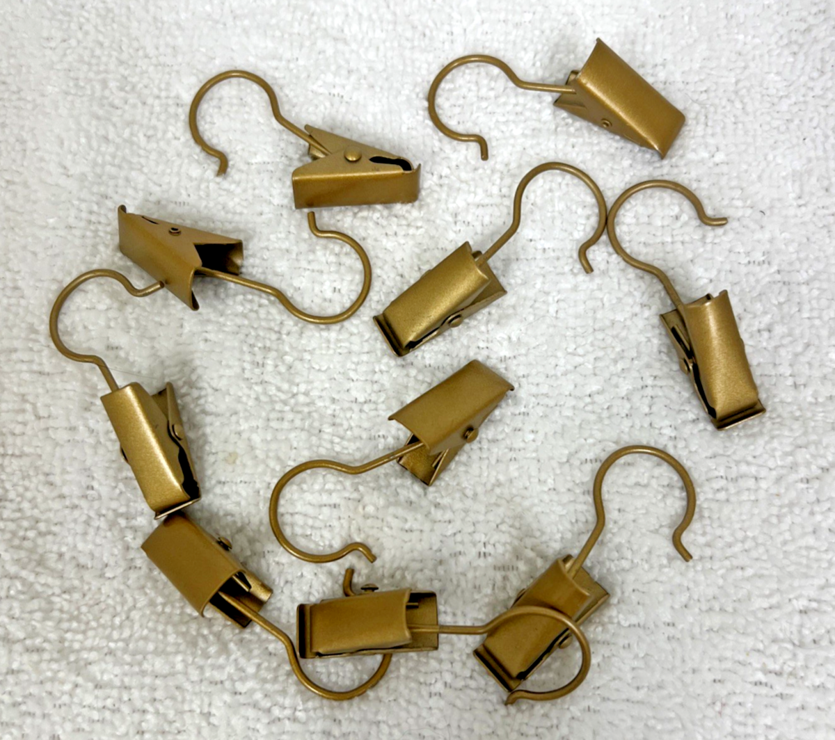 10 Small Gold Tone Metal Finished Curtain Clips Hooks Decor Crafts Display. Small gold tone metal clips measure approx. 1" including the hook portion measures approx. 2 1/8" long. Very good used condition, paint coloring in very good shape on a couple some slight wear, no damage to clips or hooks. See pictures.