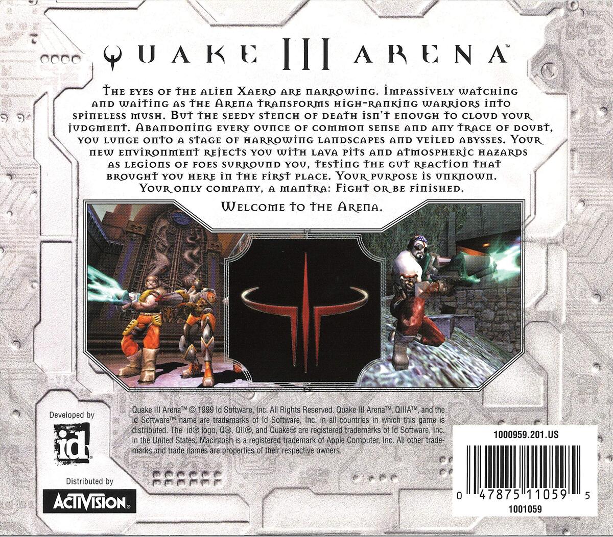 Product description: The Arena Eternal was constructed by the mysterious Vadrigar, the enigmatic Arena Masters, far in the past. The arena was designed to satisfy the Vadrigar's insatiable hunger for carnage and battle. Now you, as a gladiator, must enter battle against the most powerful warriors in history who populate the Arena Eternal. More than 30 types of opponents, each with but a single thought -- survival -- awaits your appearance. Within the arena, there is only one rule: kill or be killed. Fortunately, the Vadrigar, unwilling to accept death as a way out of combat, ensure that anyone who dies is immediately resurrected and thrust back into the fray. You must climb the ranks, winning your battles against increasingly powerful foes. During gameplay, you have a wide variety of weapons from which to choose including several types of guns (machinegun, shotgun, plasma, lightning, rail, and BFG), rocket and grenade launchers, and bladed weapons. Three kinds of armor can be utilized, each uniquely affecting your armor rating, while more than a half-dozen power-ups dot the arena, providing enhanced combat abilities ranging from invisibility to flight. Med-kits, personal teleporters, health bonuses, and earned medals that count toward final battle score totals round out the many features of Quake III Arena. Single- as well as multiplayer action is offered, although the game is designed for multiplayer contests first and foremost. In single-player mode, the challenge is to defeat automated computer-controlled opponents at each level in order to unlock tougher levels. During multiplayer action, five specific game types are available including all, free-for-all, tournament, team deathmatch, and capture the flag. Many options allow full customization of multiplayer games and feature control over aspects such as 'bot skill levels, frag, capture and time limits, connection to dedicated servers, player list designation, and friendly fire rules.
