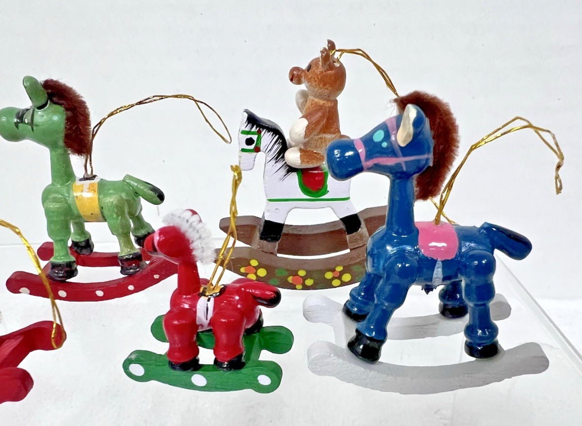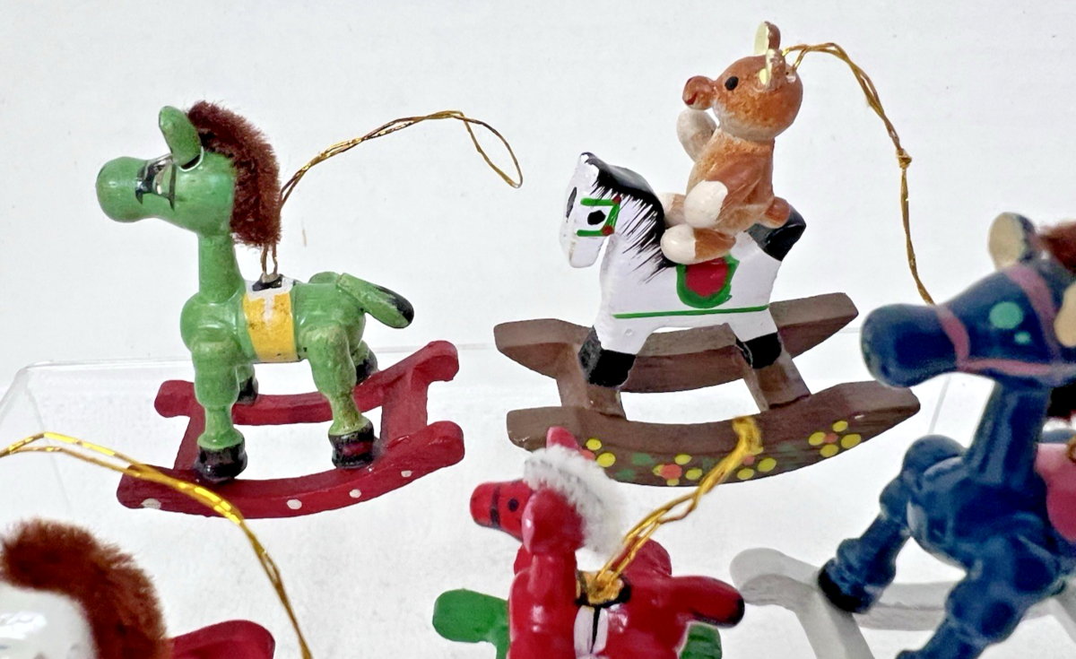 5 Vintage Miniature Hand Painted Wooden Rocking Horse Teddy Bear Ornaments. Miniature rocking horse ornaments pipe cleaner manes range in size from tiny red horse green rockers measures 1 1/4" tall and 1 1/4" long to the largest teddy bear on brown rockers measures approx. 2 3/8" tall and 2" long. All in very nice condition, no damage.