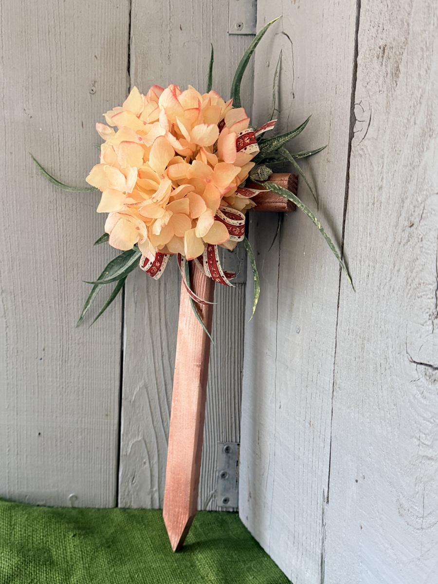 This 18” rustic pine cemetery cross has been painted copper with a large pale peach hydrangea, lots of greenery layered, and floral lace trimmed ribbon.