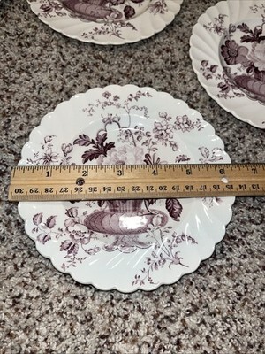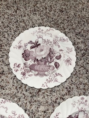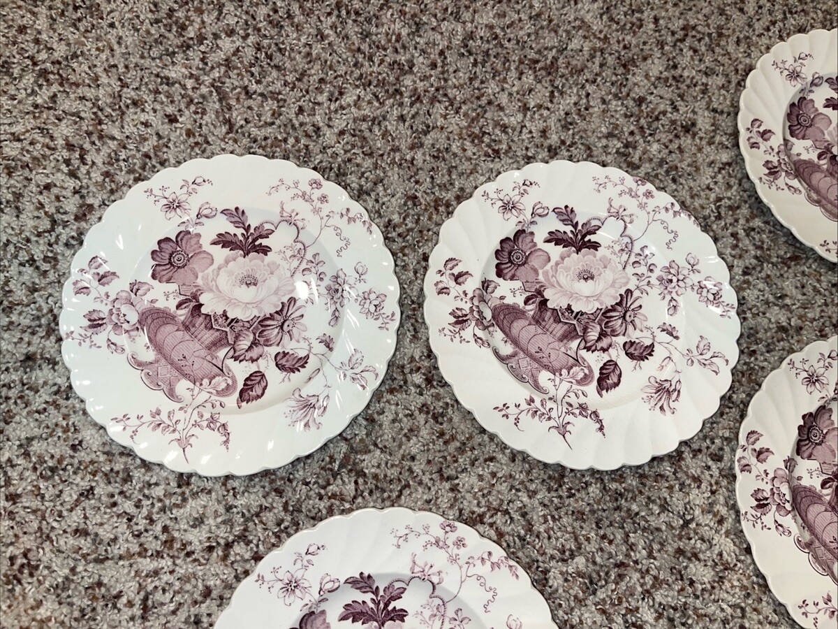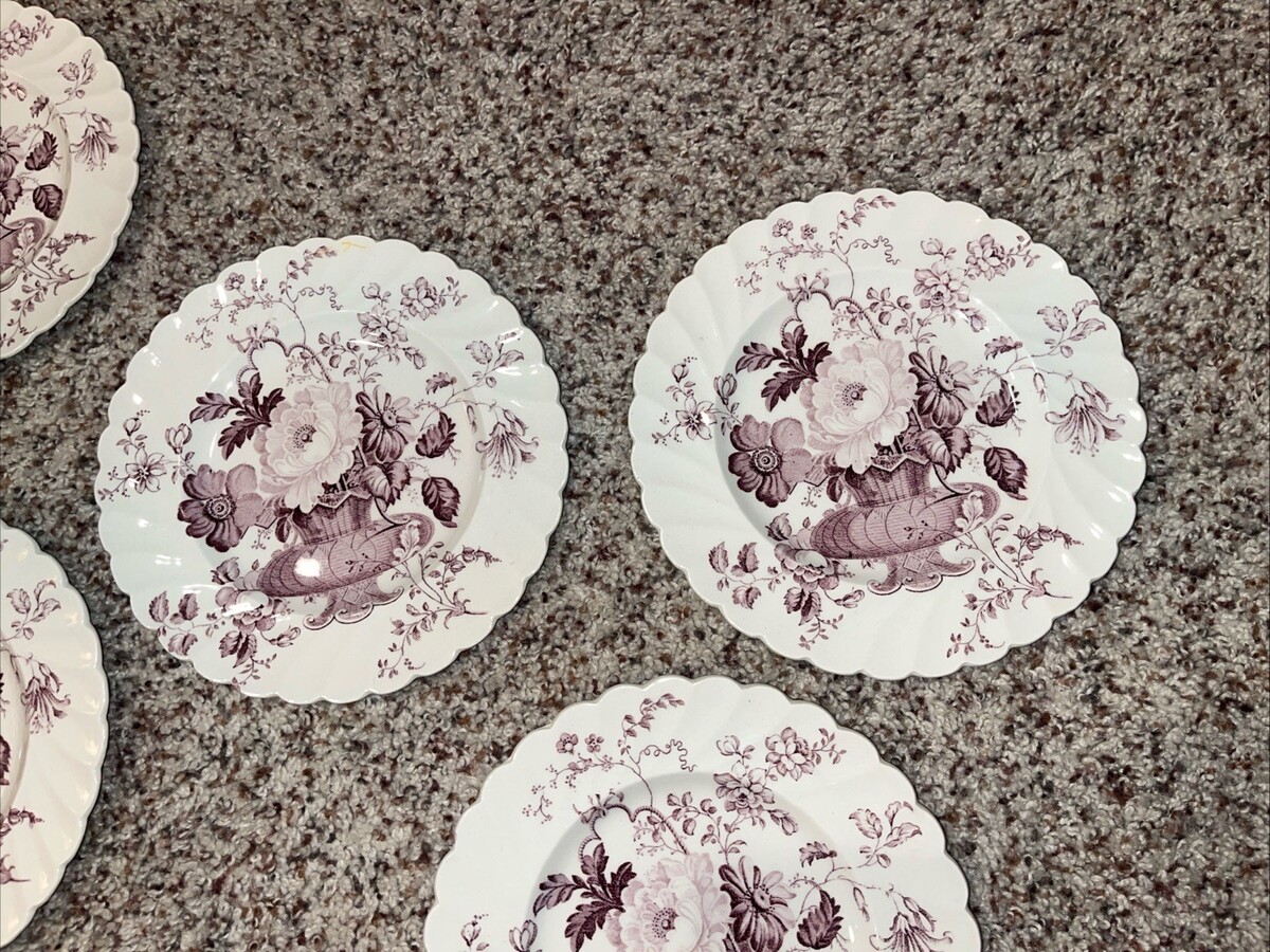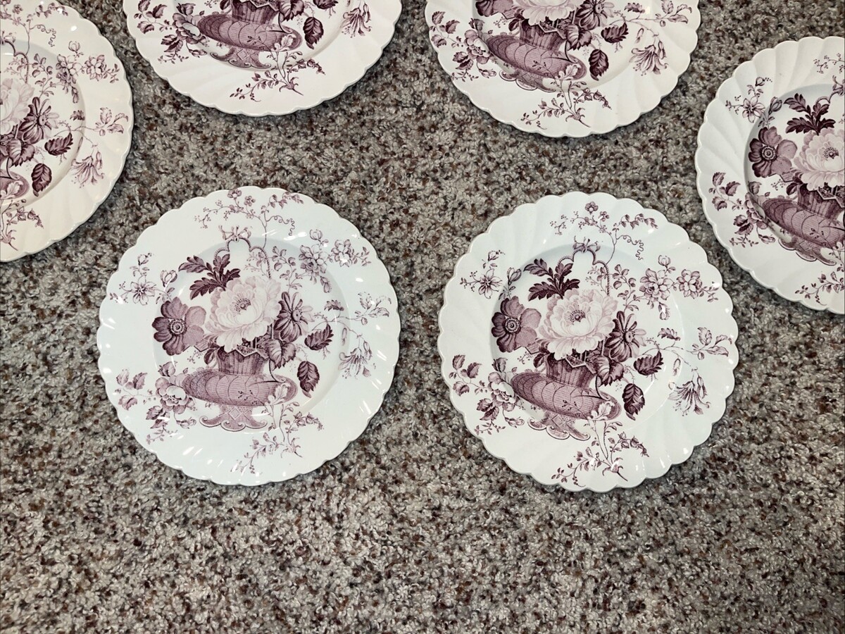 The 7 Clarice Cliff Charlotte Purple Royal Staffordshire bread butter plates are a set of antique round porcelain plates with a beautiful Basket and Flowers pattern. Made in Staffordshire, England, these plates have a Victorian style and a lavender color, perfect for any occasion. With a diameter of 6.5 inches, these vintage plates feature a glazed finish and are part of the Royal Staffordshire Burslem England product line. The set includes seven pieces, each depicting intricate flower details, adding a touch of elegance to any dining table.