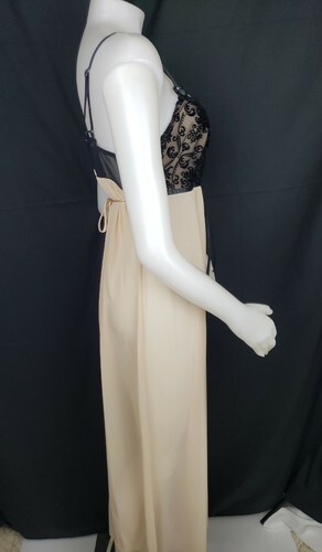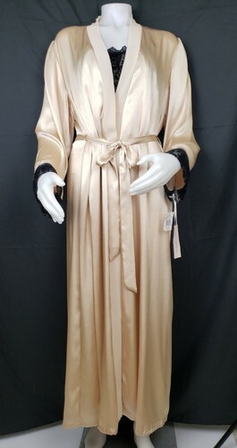 Champagne Satin Peignoir Set S/M Long Sheer Nightgown Gown Velvet Lace Tie Robe