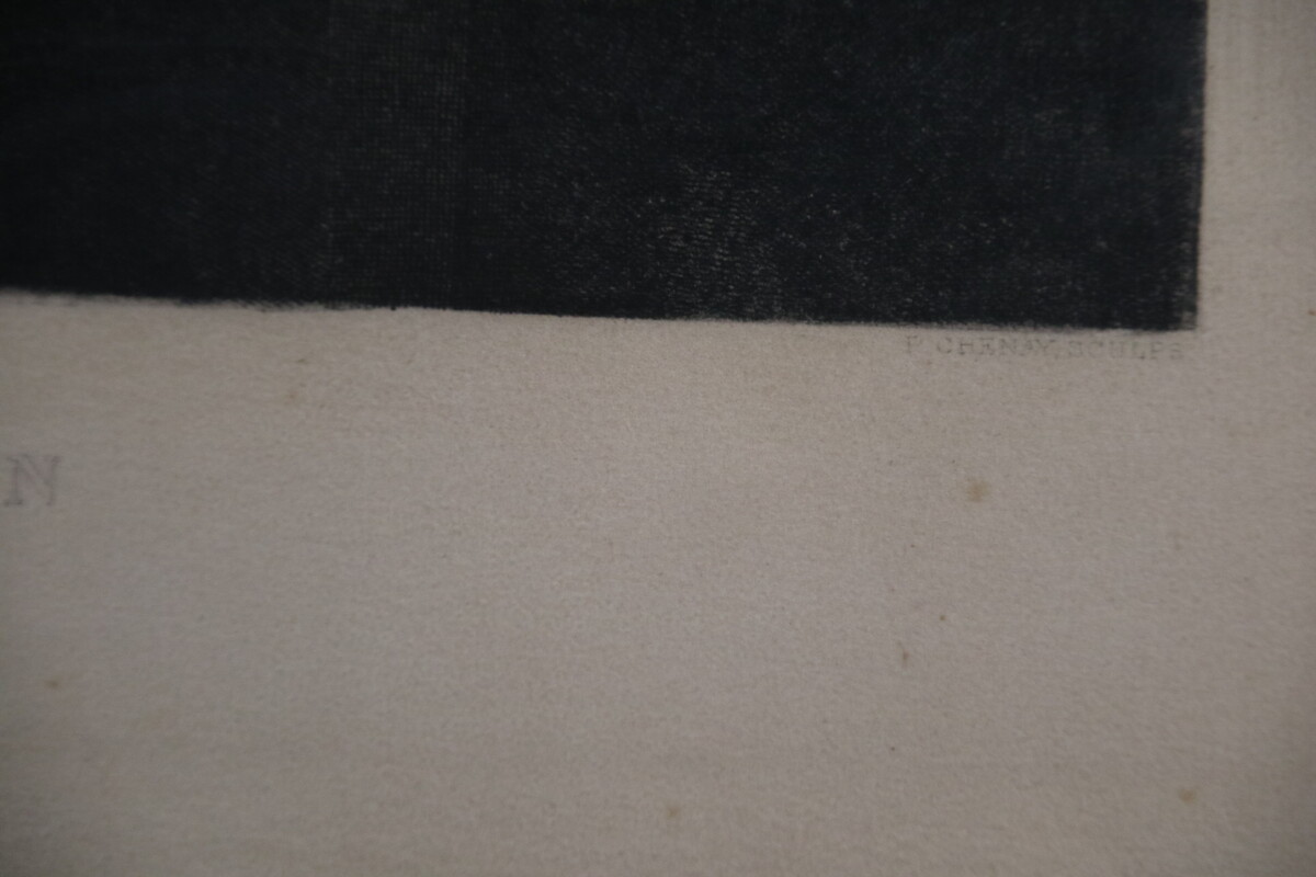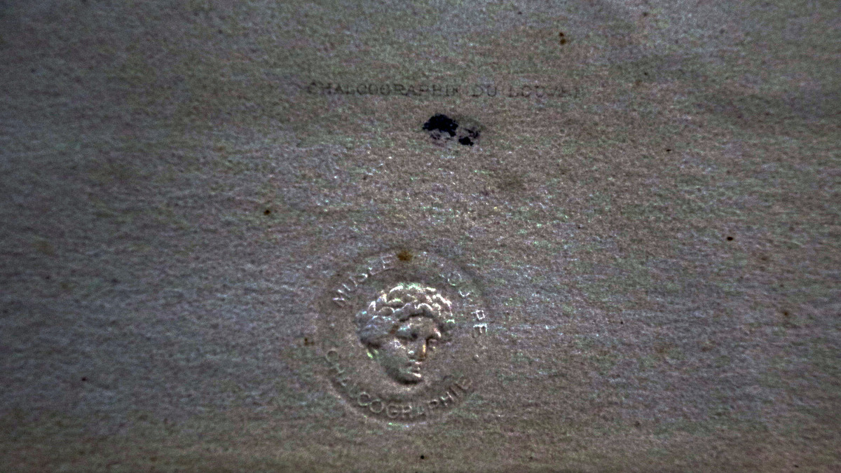 Large museum-authorized engraving after Rembrandt, titled “Portrait d’un Rabbin.” Printed by the Chalcographie du Louvre and bearing the official embossed seal. 20th?century copperplate restrike from the Louvre’s historic engraving collection. Beautifully framed in an ornate gilt frame. A striking decorative Old Master piece.