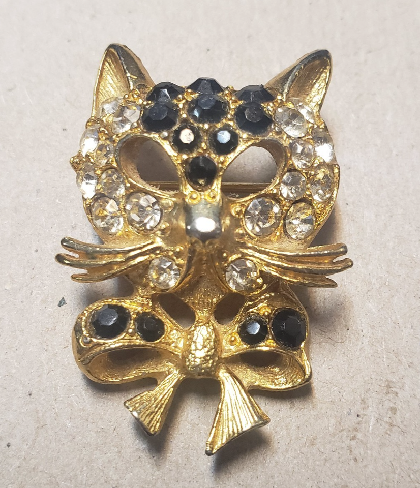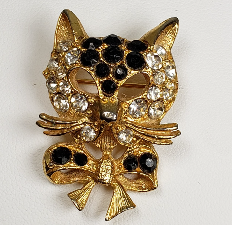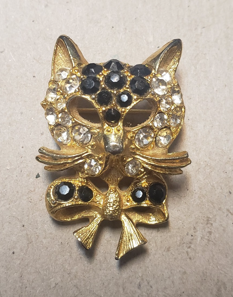 Vintage Signed Robert Rose Black Clear Rhinestone Crystal Cat Face Brooch