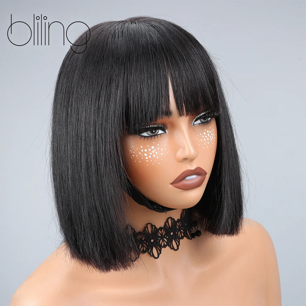200% Human Hair Wig With Bang Natural Glueless Straight Layered Bob 8inches