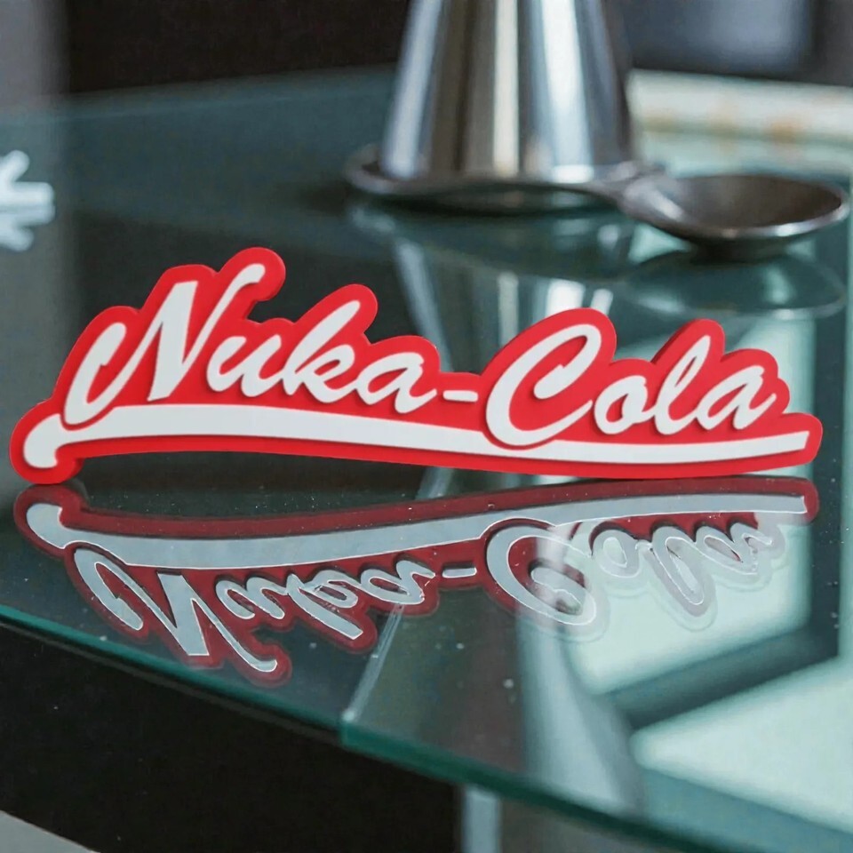 Show off your love for the wasteland's favorite beverage with this vibrant Nuka-Cola logo collectible. This item features the iconic Nuka-Cola script in raised white lettering on a classic red background, capturing the signature look from the Fallout series. Crafted from a durable and flexible rubber-like material, it is perfect for use as a drink coaster to protect your surfaces or simply as a display piece. It's an essential piece of memorabilia for any fan's collection or gaming setup.