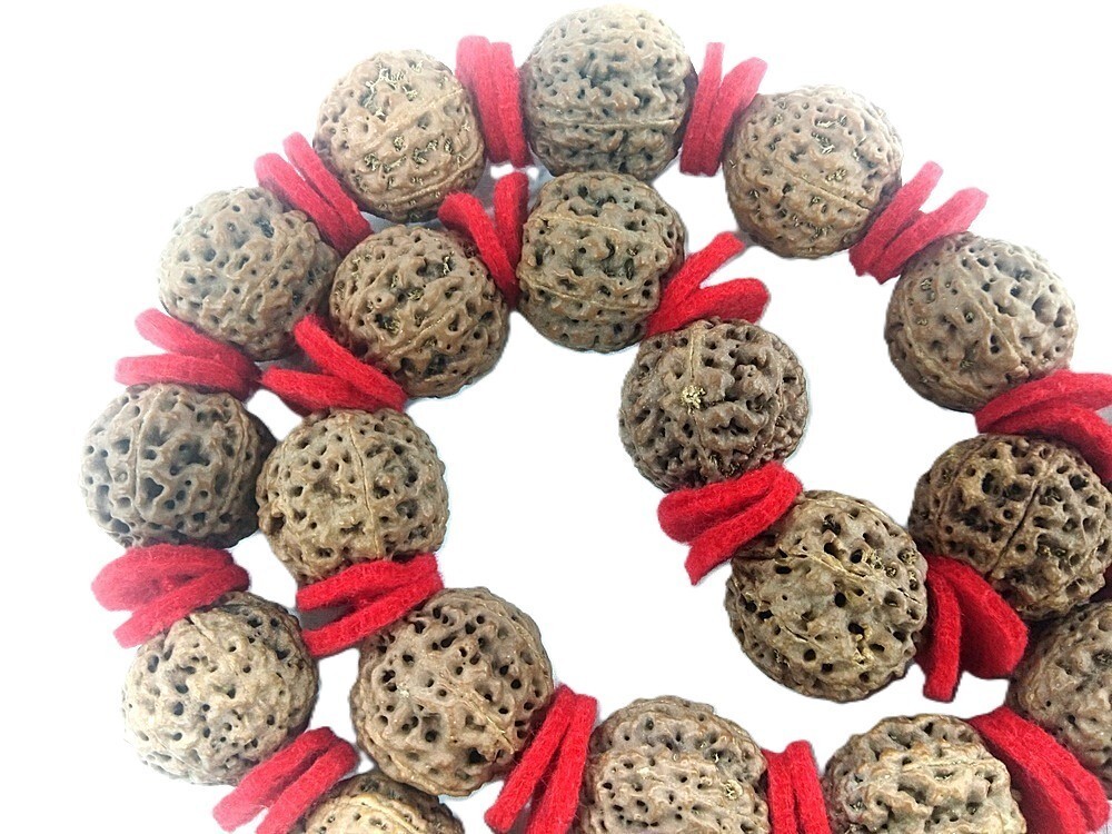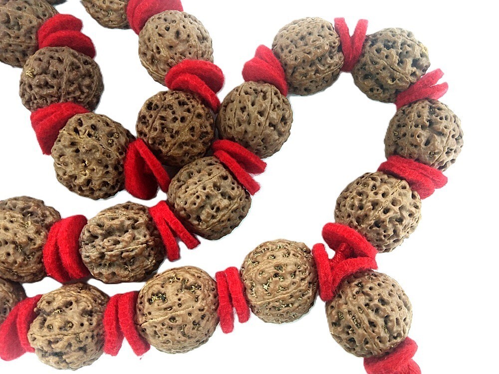 Design : 27+1 beads of high quality 7 mukhi rudraksha of Java strung in strong thread having traditional knots between beads with Woolen spacers .