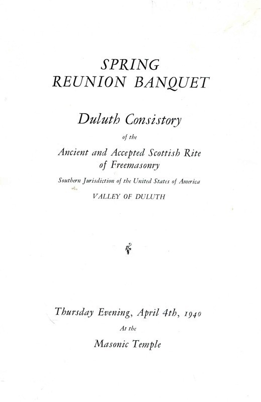 An 12 page menu and program in a decorative cover from the Duluth Consistory of The Ancient and Accepted Scottish Rite of Freemasonry , Spring Reunion Banquet held in 1940 at the Masonic Temple. Has a Dinner Menu, Salutation, Allegiance, Toasts, Photos of Dignitaries, Members of Committees, Thirty Third Degree Member and more. Measures about 5" x7" when closed