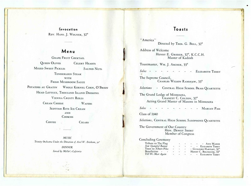 Duluth Consistory 1940 Spring Reunion Banquet Menu and Program Masons