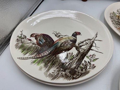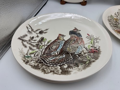 The six motifs included are: Pheasant, Ruffed Grouse, Wild Turkey, Partridge, Quail, and Woodcock. They measure 11 1/4" x 10 1/4" and are in overall very good estate condition with no chips or cracks. The Pheasant and Ruffed Grouse plates have some crazing, as is common with this pattern.