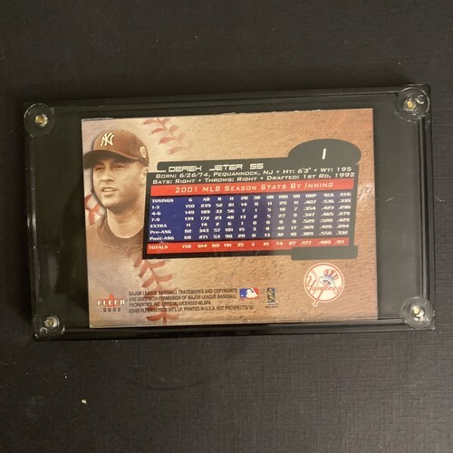 This is a special Derek Jeter trading card from the 2002 Fleer MLB Hot Prospects set. The card features Jeter in his New York Yankees uniform and is numbered #1. It is a great addition to any baseball fan's collection, especially those who admire Jeter's career. The card is in excellent shape and is perfect for display or trading. Don't miss out on this opportunity to own a piece of baseball history.