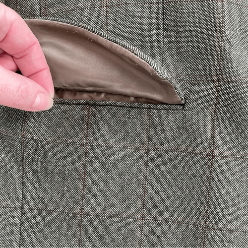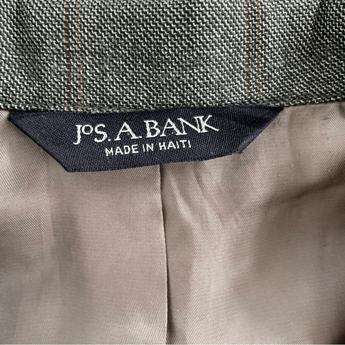 Mens Jos A Bank sport coat in a subtle greenish Glenn plaid. 100% wool with double button closure and single back vent. Lined. Front flap pockets are still stitched shut. Two interior pockets. Measurements are approximate and taken while laying flat: 33 inches shoulder to ham, 24 inches armpit to armpit, 20 inches from shoulder seam to shoulder seam and 25.5 inch sleeve