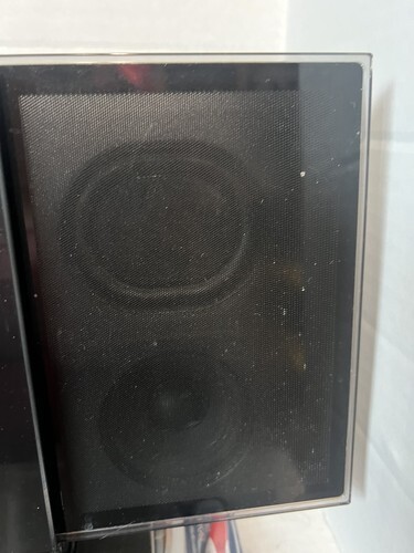 Item has been tested and works. Remote included. Some scratches, spots on speakers and some dust accumulation.