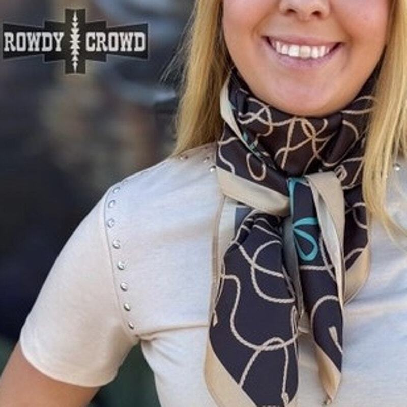The Rhinestone Cowgirl Wild Rag is playful, punchy, and made for the girl who loves a little flair. Set on a deep black background, this silky wild rag features an allover rope pattern with bright turquoise bows that add the perfect pop of color. The design is bold without being overwhelming.