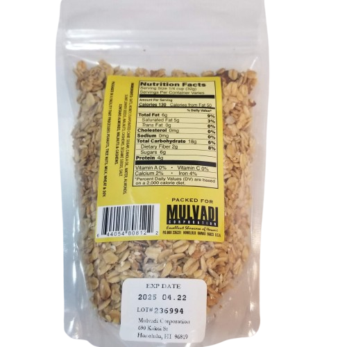 Made in Hawaii by Mulvadi, this wholesome granola combines crunchy oats, roasted almonds, and the natural sweetness of honey for a deliciously healthy snack. Perfect as a breakfast topping, trail snack, or guilt-free treat, this granola brings the taste of the islands to your table.