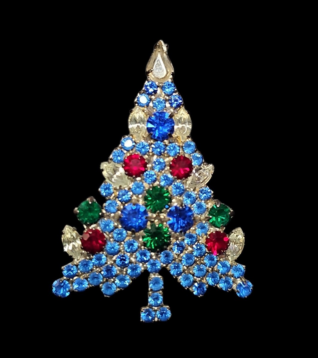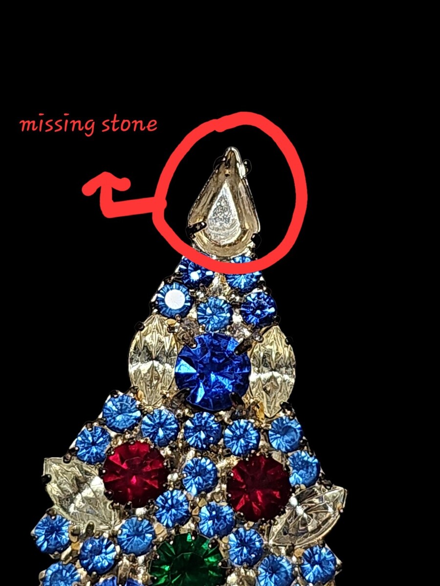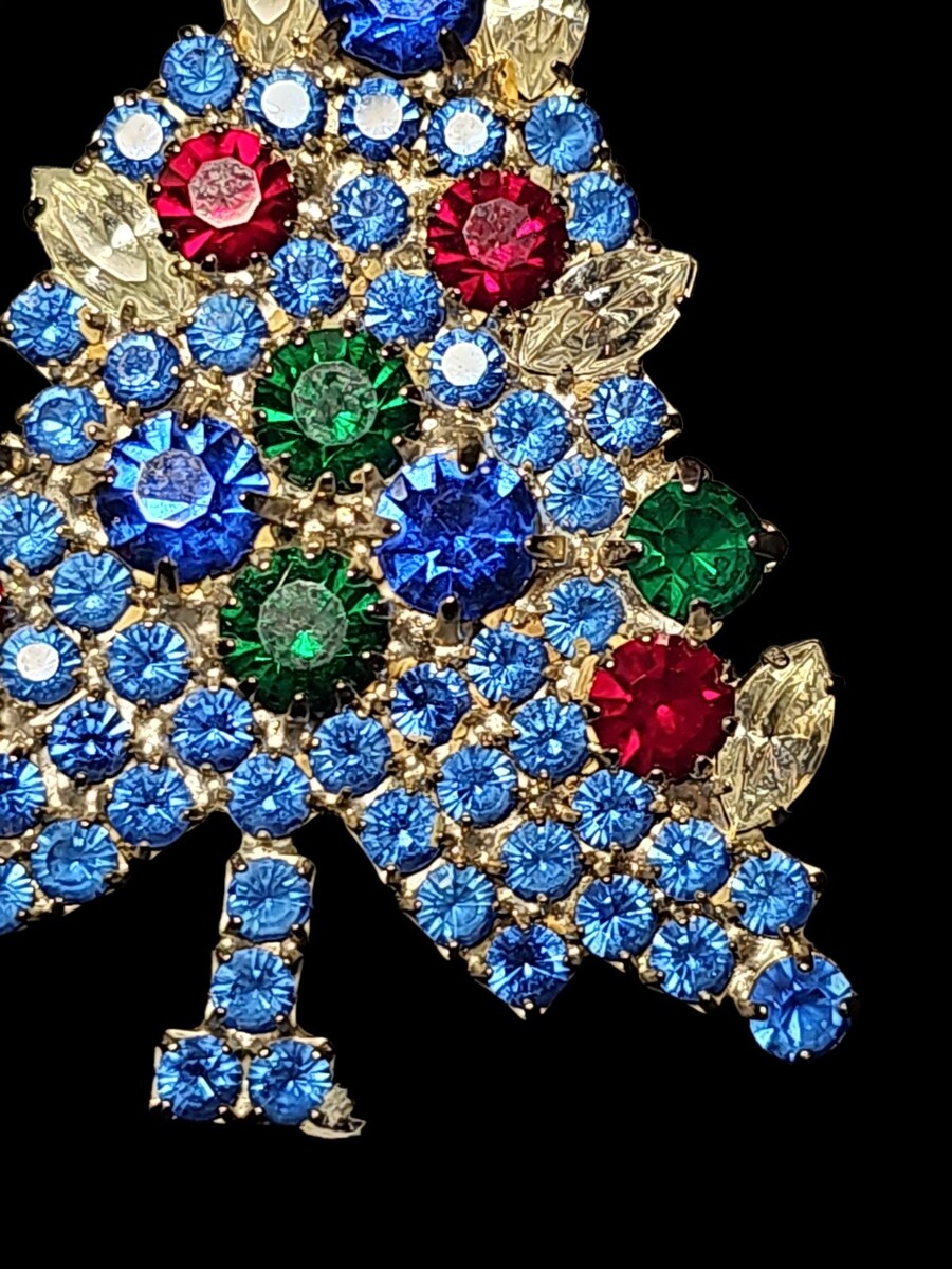 Condition note: one small clear stone is missing from the very top section of the tree (clearly shown and circled in the photos). This does not affect the structural integrity of the piece and is common in vintage crystal jewelry of this type. All other stones are present, secure, and bright.