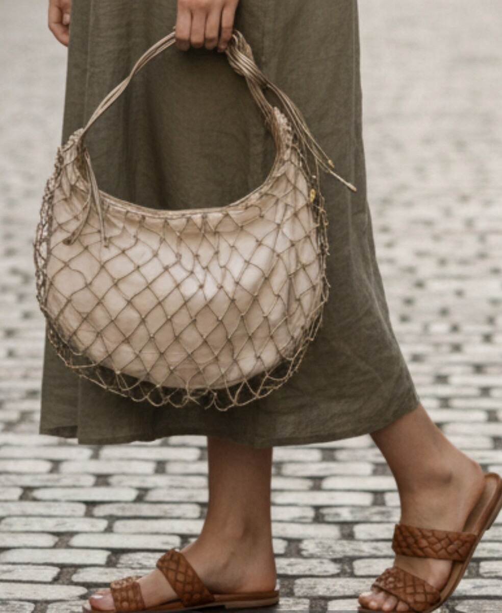 HOBO Kira Shoulder Bag Mystic Gold Leather Macrame & Canvas Handbag Purse