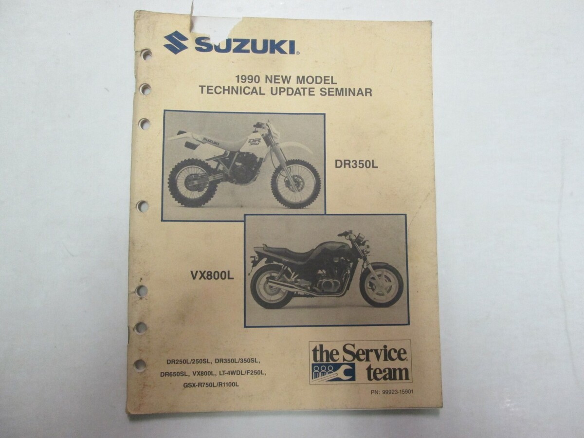 1990 SUZUKI DR350L VX800L LT-4 NEW MODEL TECHNICAL UPDATE SEMINAR MANUAL STAINED This manual is informative with illustrations, covers a wide arrange of models. This is a TECHNICAL UPDATE SEMINAR Manual, NOT a service manual. We will leave POSITIVE Feedback after we receive your payment. Please do not forget to give us POSITIVE Feedback and FIVE Stars on all of the Detailed Seller Ratings! If you are not satisfied with your shopping Experience, please contact us to get a solution before you decide to leave a NEUTRAL or a NEGATIVE Feedback, We will do our best to solve any problems for you as soon as possible. We will provide you with the BEST POSSIBLE service because the POSITIVE Feedback and FIVE Stars are what we are striving for. Please email me through "My Messages" or "Ask Seller Que