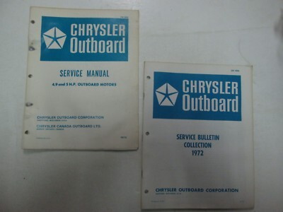 1972 Chrysler Outboards 4.9 5 HP Outboard Motors Service Manual Set Service Manual is dirty and most pages have water damage towards bottom of the page. Everything is still legible. Service Bulletin is in decent condition. We will leave POSITIVE Feedback after we receive your payment. Please do not forget to give us POSITIVE Feedback and FIVE Stars on all of the Detailed Seller Ratings! If you are not satisfied with your shopping Experience, please contact us to get a solution before you decide to leave a NEUTRAL or a NEGATIVE Feedback, We will do our best to solve any problems for you as soon as possible. We will provide you with the BEST POSSIBLE service because the POSITIVE Feedback and FIVE Stars are what we are striving for. Please email me through "My Messages" or "Ask Seller Questio