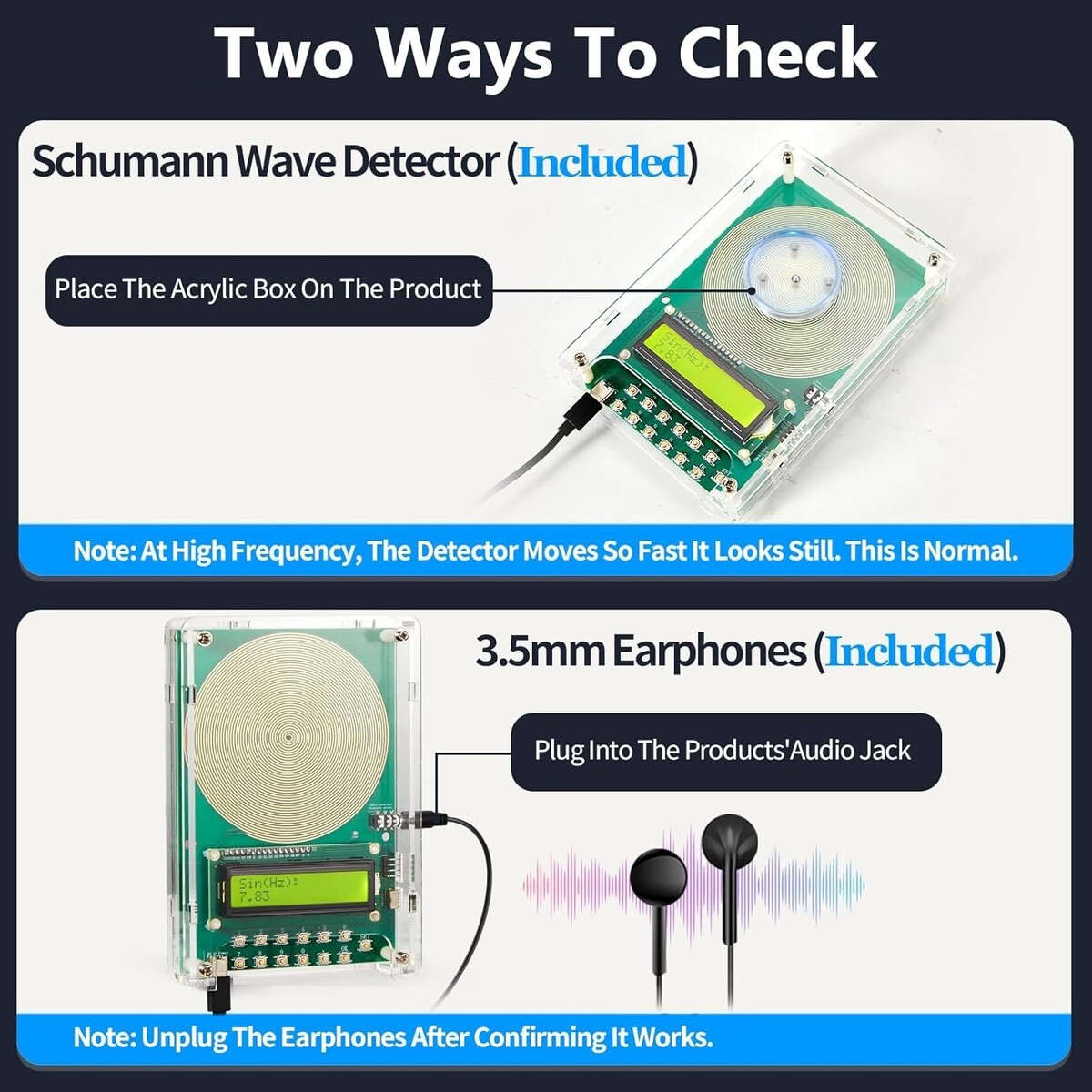 Dual Check System: Features a Schumann wave detector and wired headphones for confirming correct operation.