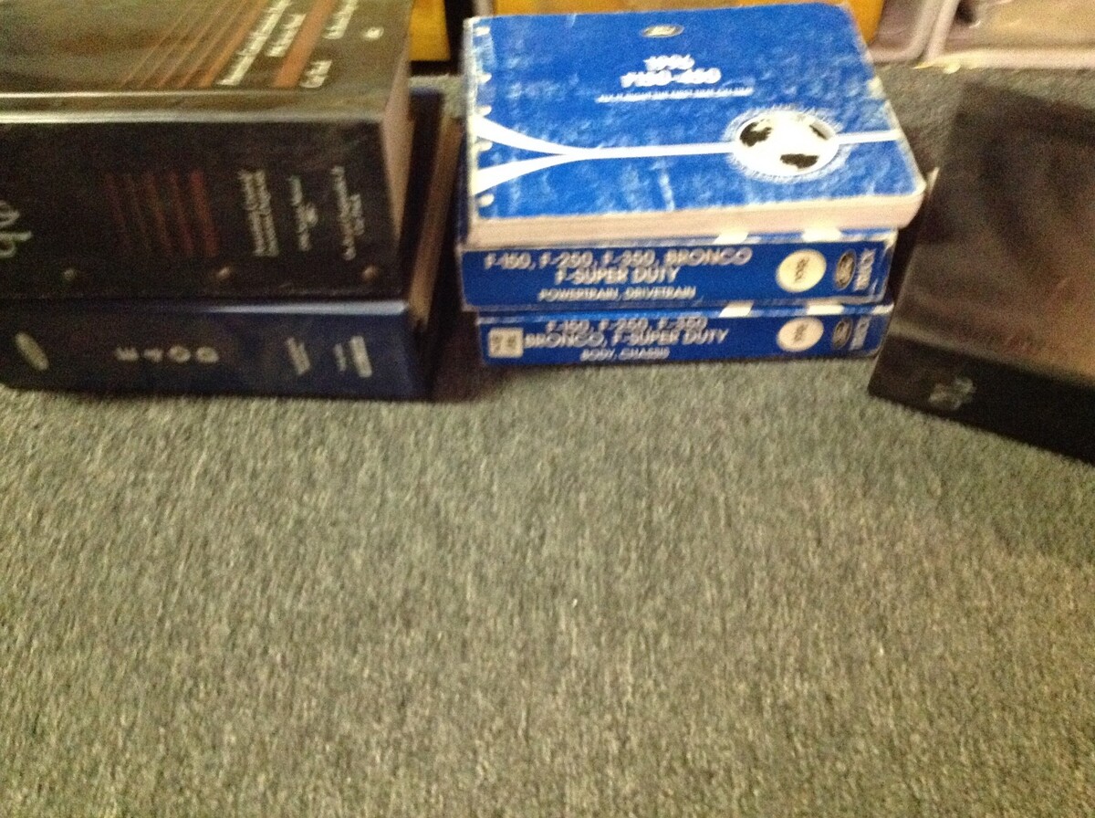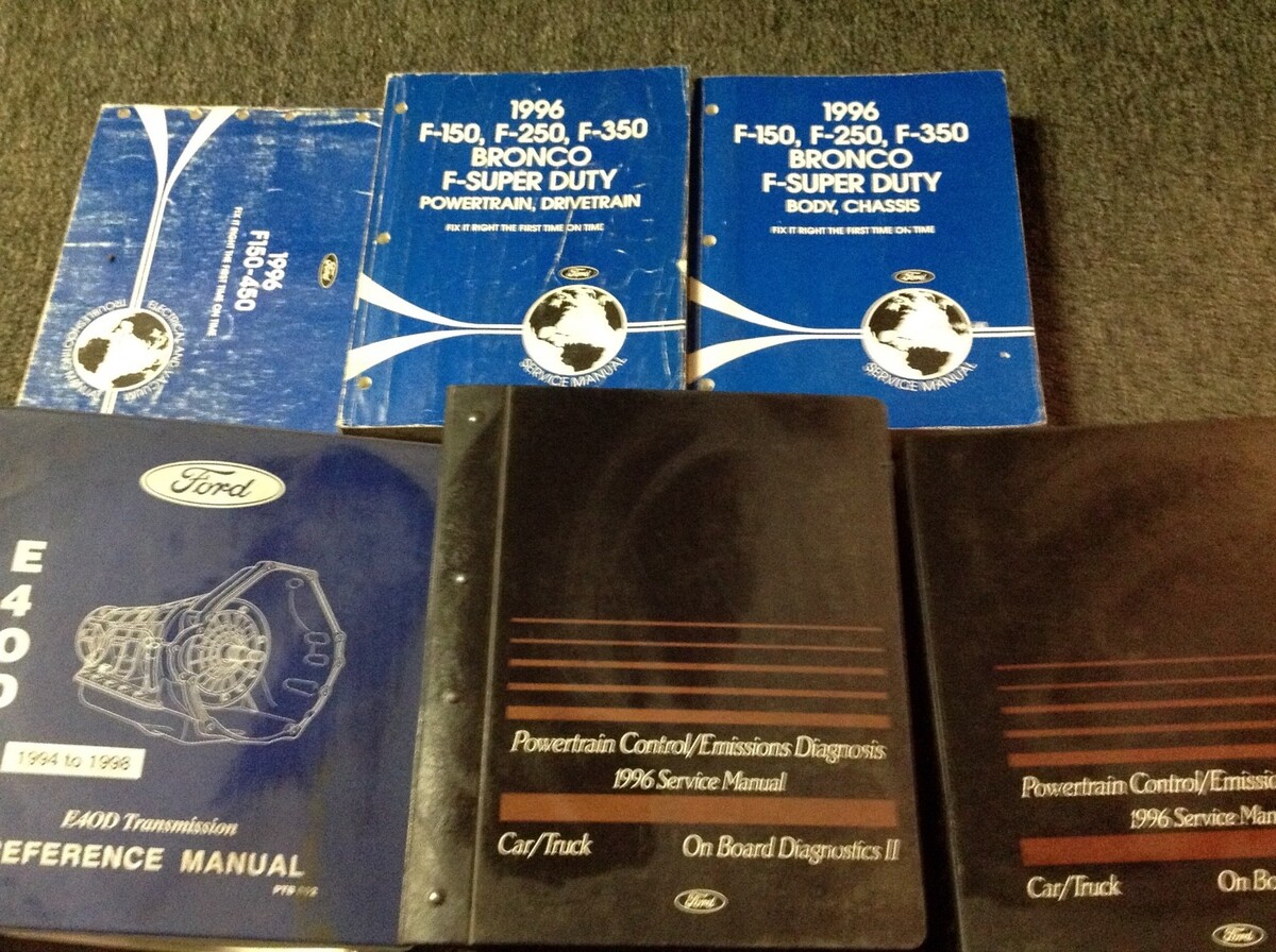 Manuale di servizio gruppo propulsore/trasmissione Ford F-150/250/350/ Bronco /F-Super Duty del 1996, manuale di servizio carrozzeria/telaio, manuale di risoluzione dei problemi elettrici e di aspirazione, manuale di riferimento della trasmissione e manuale di diagnosi delle emissioni di controllo del gruppo propulsore