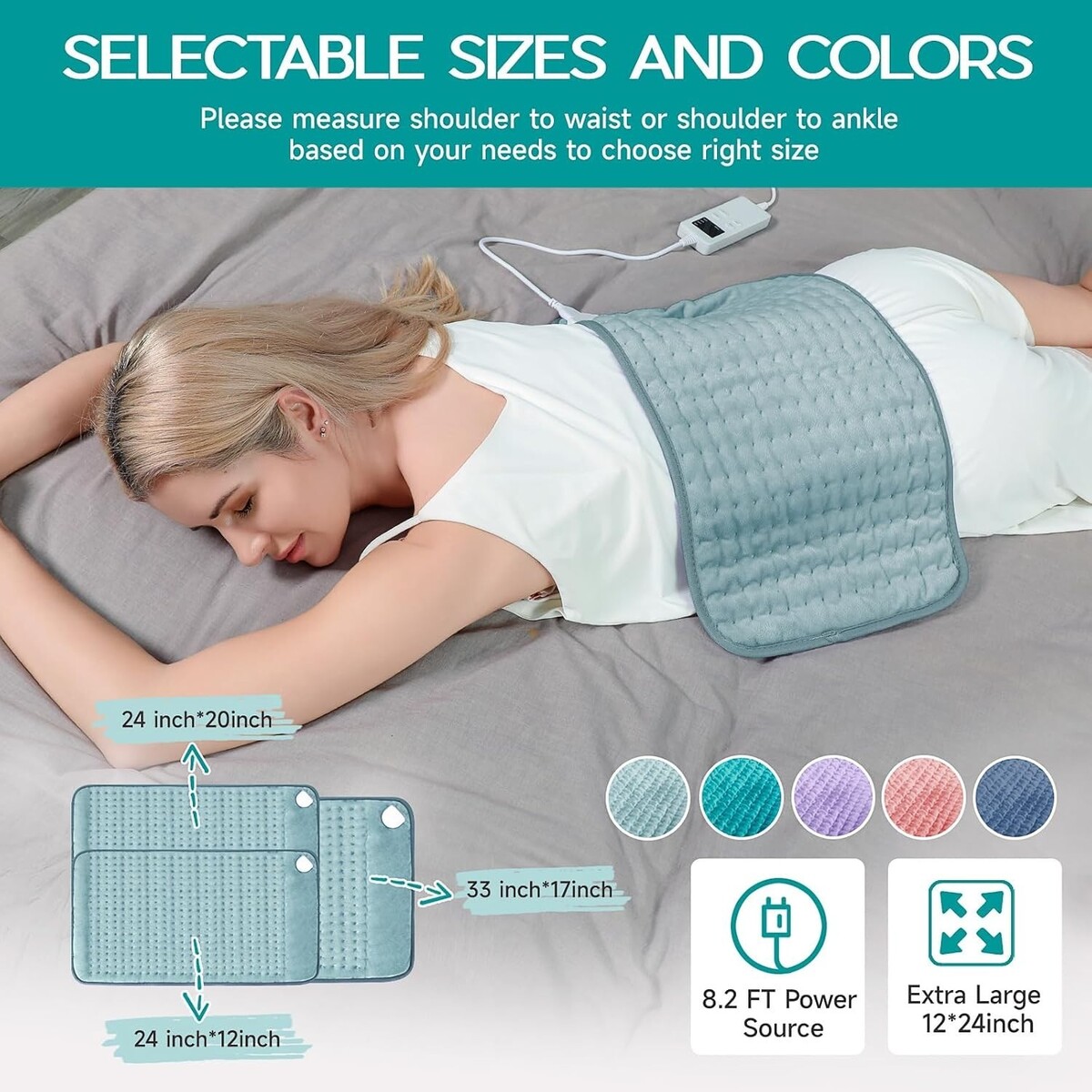 Selectable sizes (12"x24", 20"x24", or 17"x33") and multiple colors for personalized comfort.