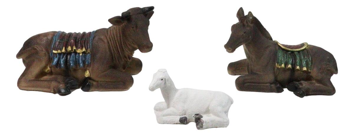 ? Depicting the auspicious nativity of Jesus this set is complete with Joseph, Mary and baby Jesus. This classic nativity set also includes the 3 Wise Men bearing gifts, Shepherd, 3 farm animals and an angel. The sculpture set totals 11 pieces.