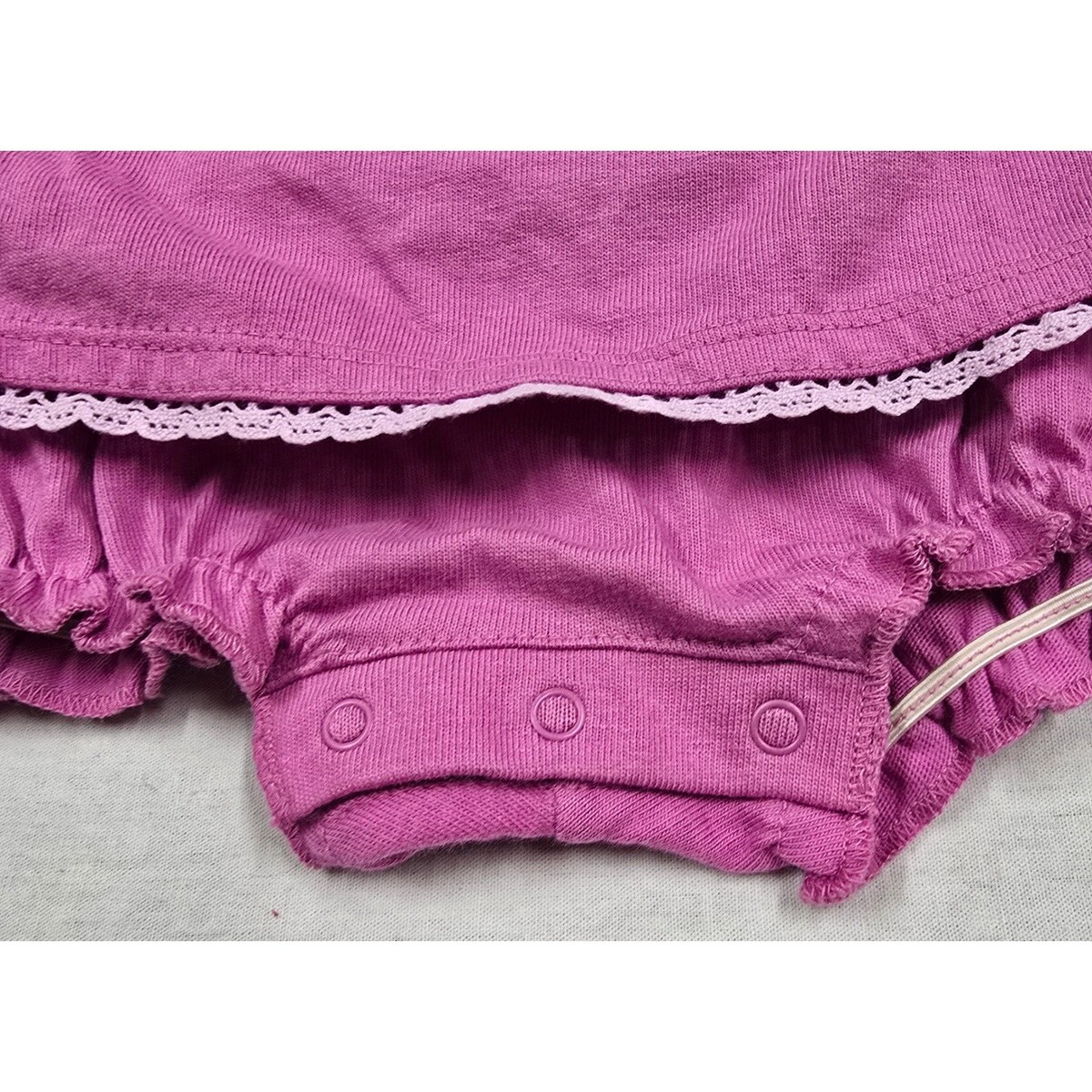 Features: Snap closures, elastic waist, ruffle trim, starfish applique