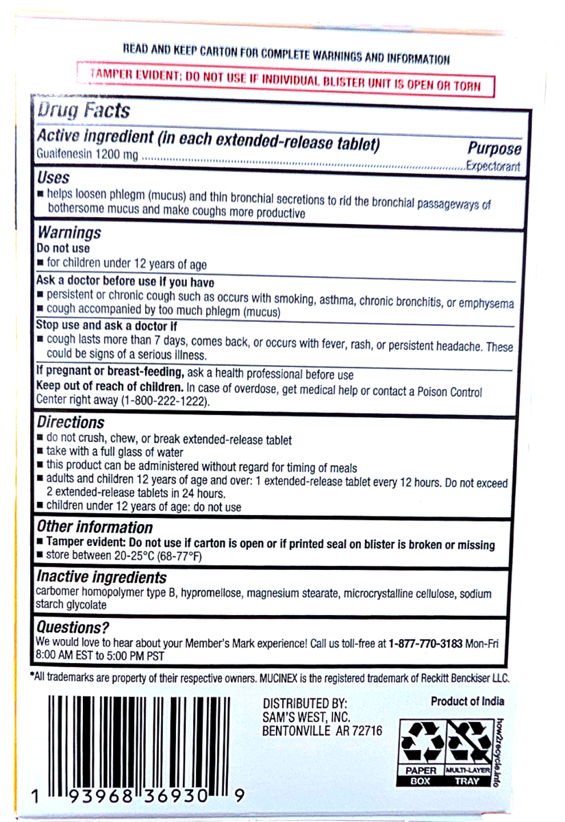 Member's Mark Max Strength Mucus Relief Guaifenesin Tablets 1200mg 56 Ct ED11/27