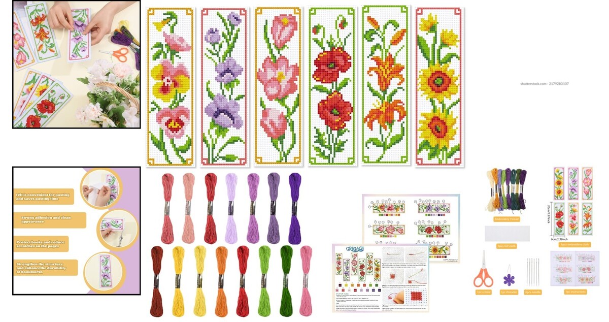 DIY 6 Flower Pattern Embroidery Bookmarks Kit - Ideal for Crafting Beginners