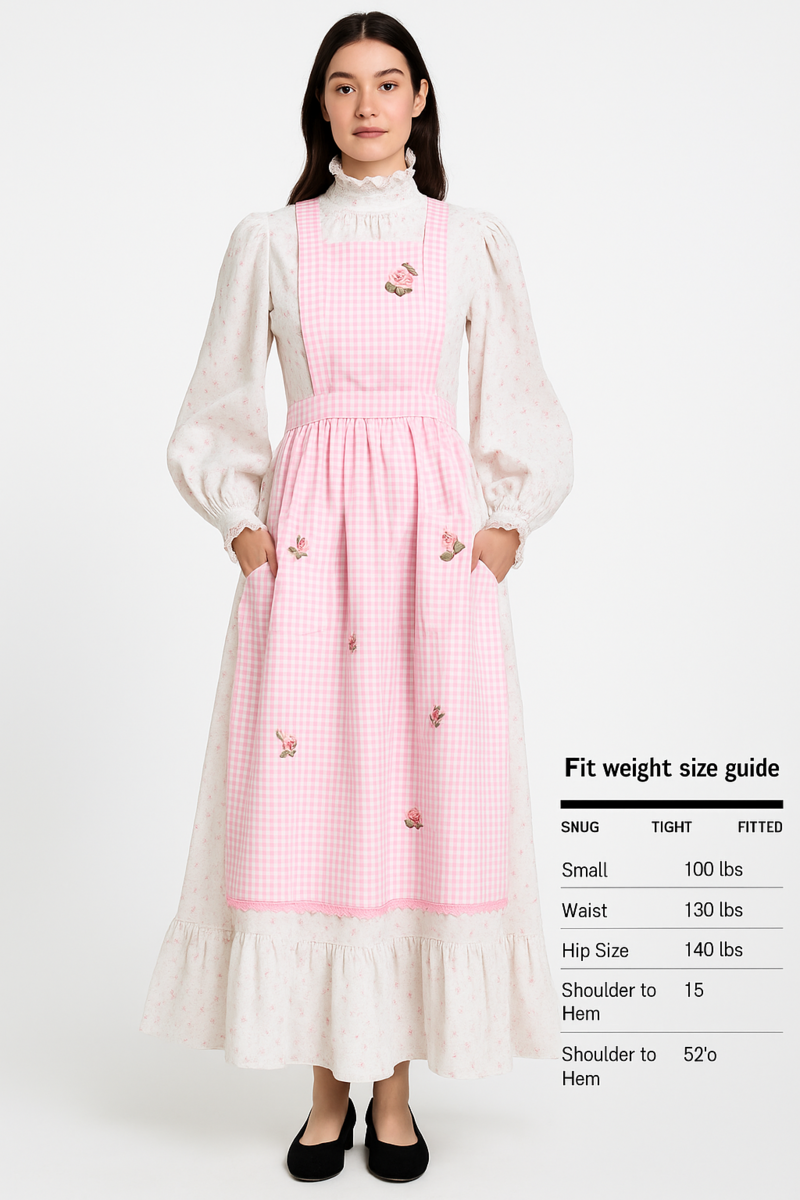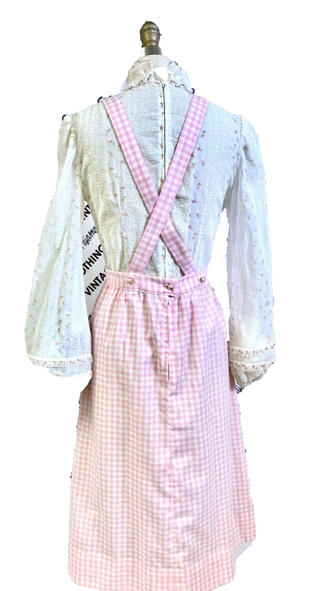 VTG 70s 2pc Prairie Dress White Pink Roses Sheer Voile + Gingham Apron S