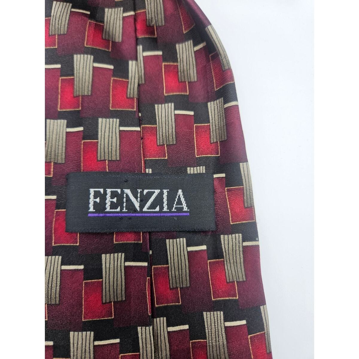 Fenzia Men's 100% Silk Handmade Tie Red Gold Square Rectangle Pattern 60"