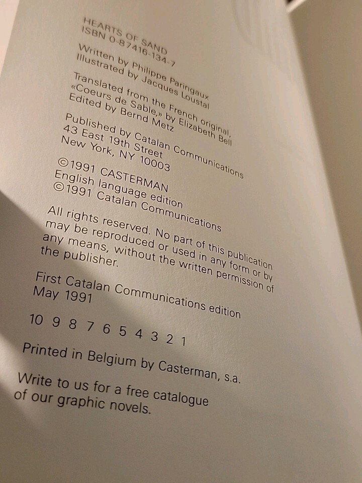 "Hearts of Sand" by Loustal Paringaux G is a 1991 trade paperback book with a narrative type of fiction. The illustrations are done by Loustal, Jacques, and the author is Philippe Paringnaux. The book, originally written in French, is translated to English and published by Catalan Communications. With 72 pages, the story falls under the genre of fiction and explores a general topic suitable for a wide range of readers.