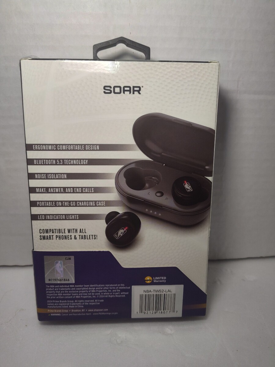 Experience your favorite beats and game day hype in style with these brand new, true wireless sport earbuds from SOAR ? officially themed for NBA LA Lakers fans! These True Wireless Sport Earbuds V.2 come with a portable charging case and deliver a comfortable, secure fit that?s great for workouts, travel, or everyday listening.