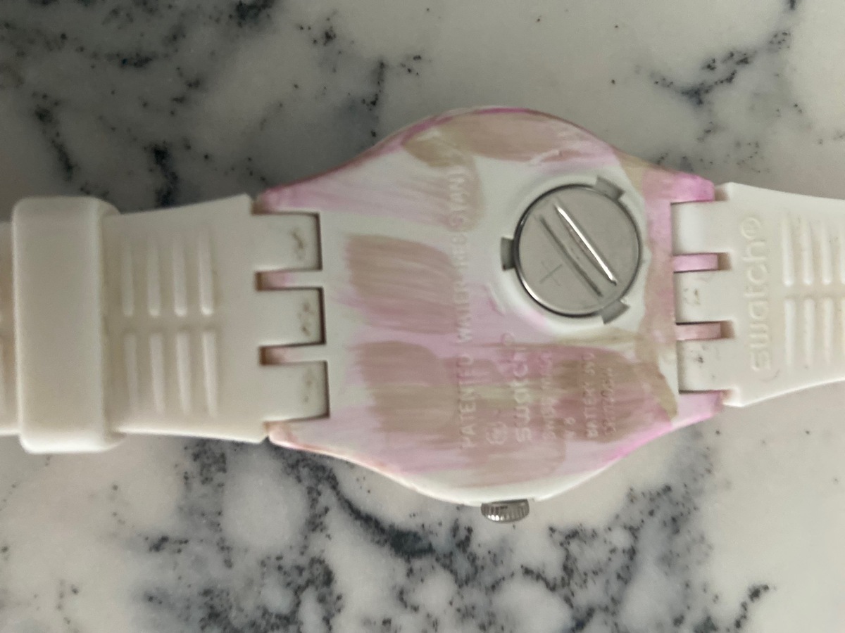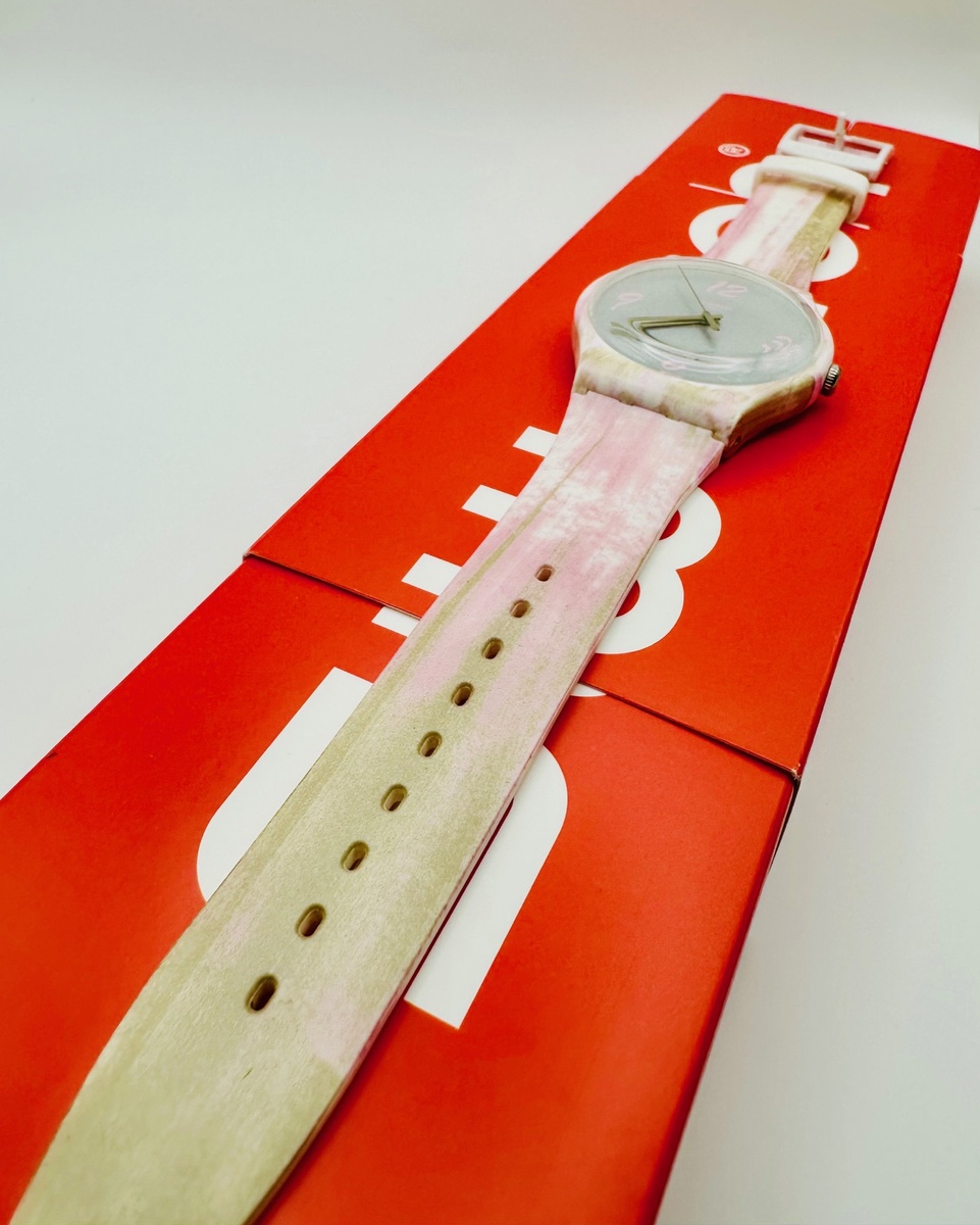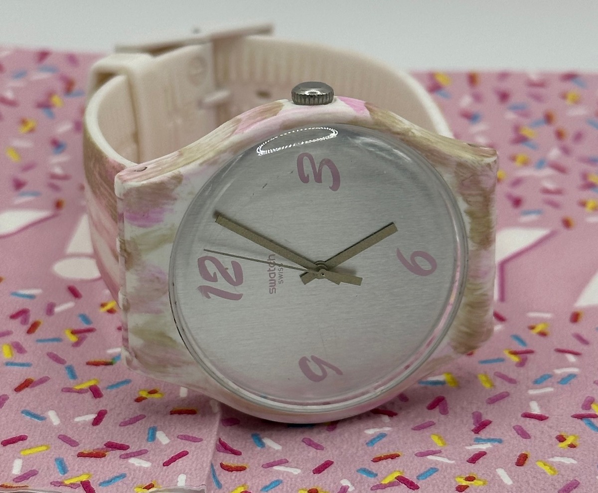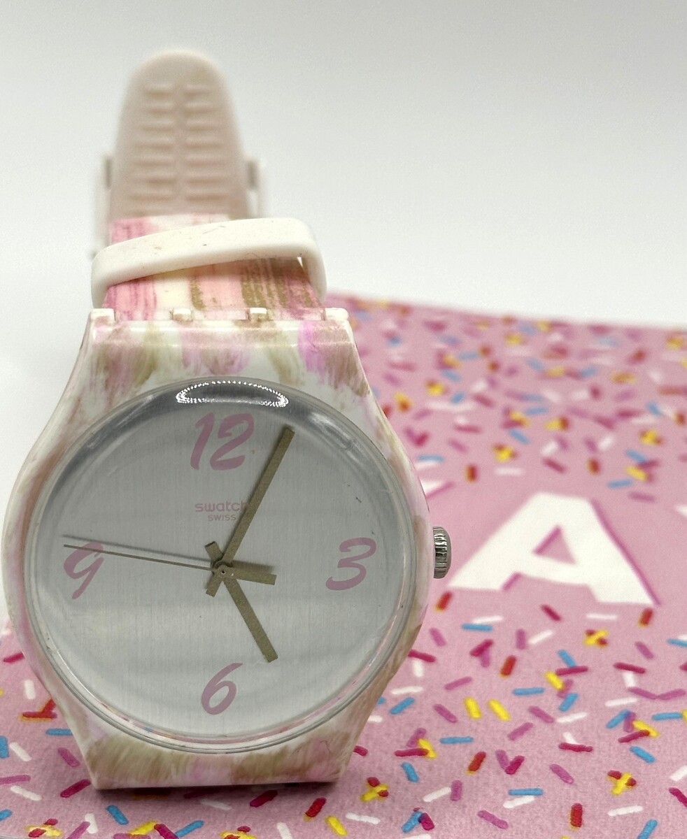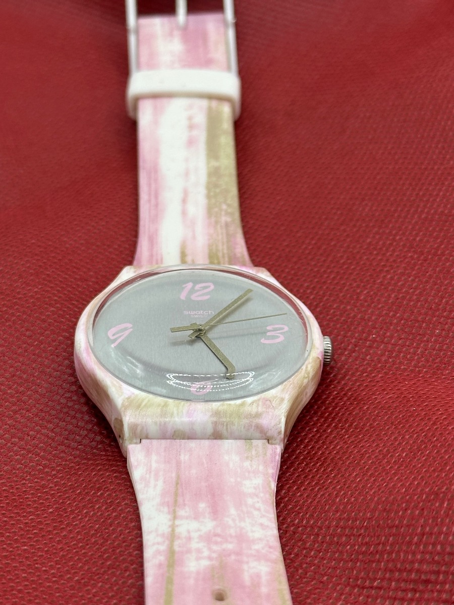 This pre-loved Swatch Pinkquarelle Grey isnโt just a watch โ itโs a splash of joy and a party on your wrist.