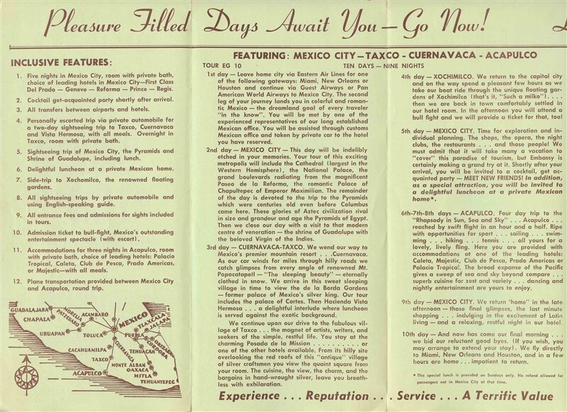 An Eastern Air Lines Happy Holidays in Mexico Brochure from the 1950's. Also for Guest and Pan American World Airways. An 8 panel fold out with map, inclusive features, itinerary, hotels and rates and more. Also Airlines information and rates from selected cities.