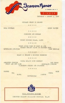 The Scaroon Manor was the site for the 1957 Warner Brothers movie Marjorie Morningstar, which starred Gene Kelly, Natalie Wood. Carolyn Jones and Ed Wynn. These menus date from the time when the movie was being filmed there.
