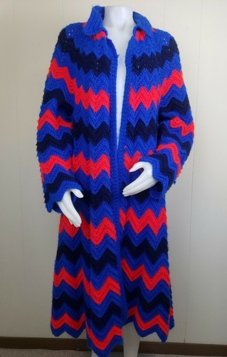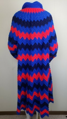 Crochet Long Coat XL Cardigan Handmade Afghan Grannycore Chevron Stripe Red Blue
