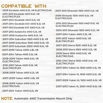 Reliable Direcly replacement - Engine Motor Mount and Automatic Transmission Mount have undergone extensive quality and safety performance testing, use the higher quality of raw materials to ensure the mount will meet or exceed your original mount's specifications Compatiblity-It will be only compatible with 07-13 Escalade Silverado Sierra 1500 Tahoe,Yukon XL 4WD V8, please use Amazon Partfinder to verify the fitment Engine Motor Mount and Automatic Transmission Mount Replace Part Number: 15854941, 15840279; A5365 A2638 Package Includes: 15854941 Front Left and Right Motor Mount, 15840279 4WD Transmission Mount 30-Day warranty, true worry-free shopping experience. If you have any problem, feel free to contact us