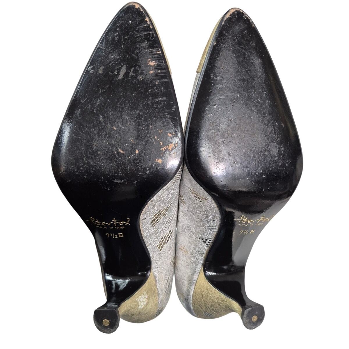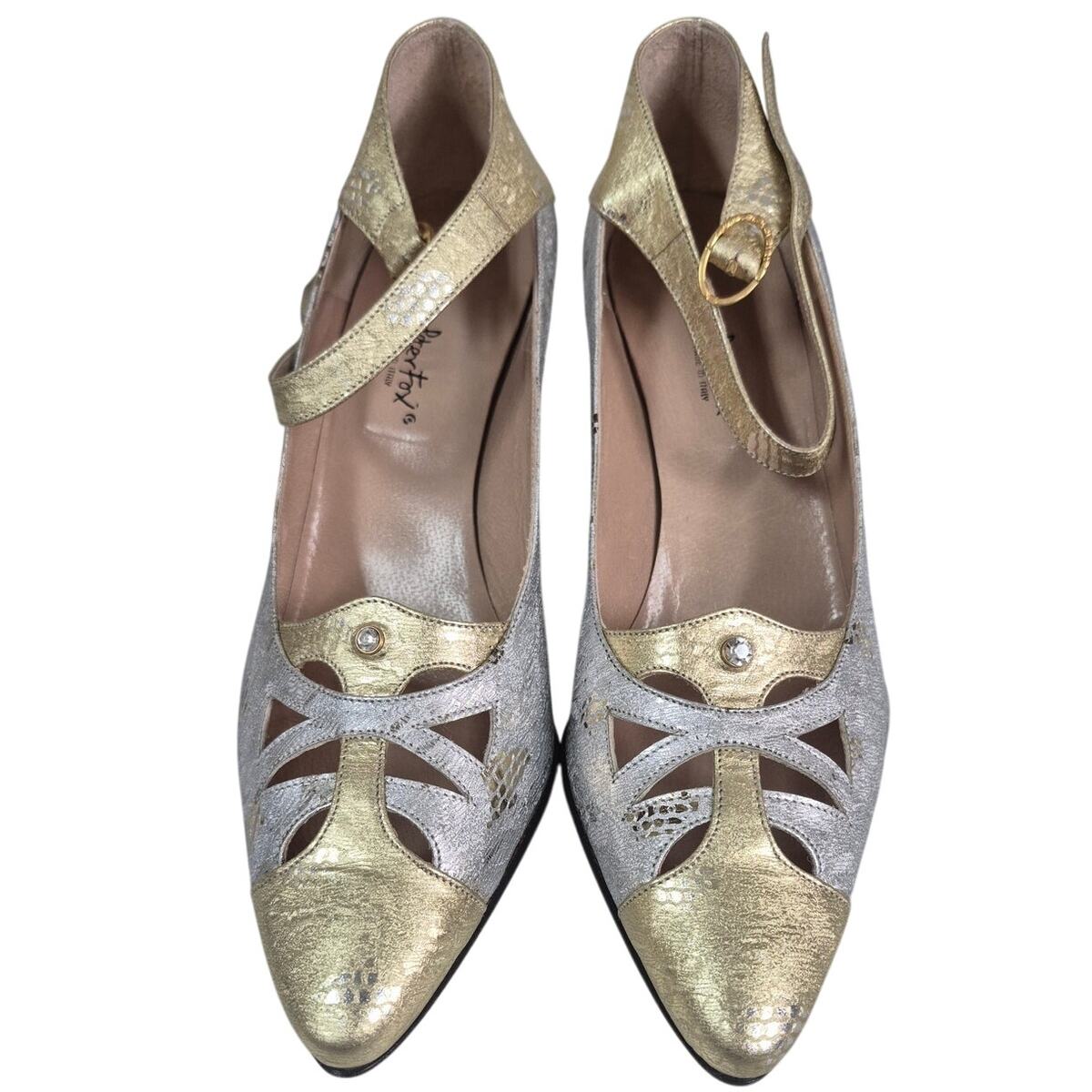 VTG 1980s Peter Fox Metallic Silver Gold Mary Jane Heels Art Deco Gatsby 7.5