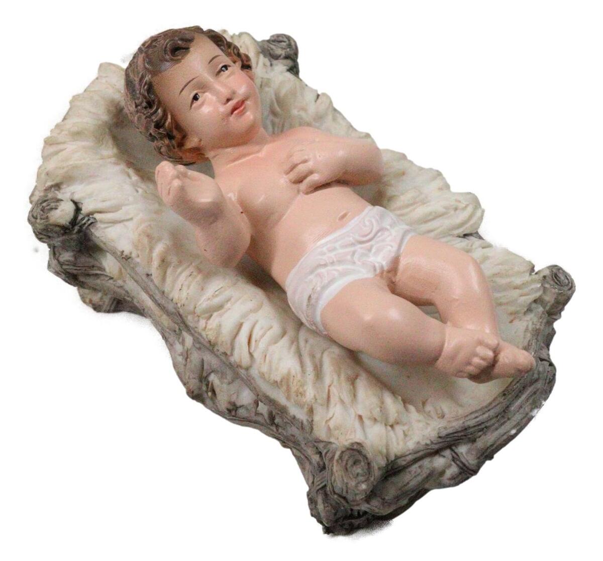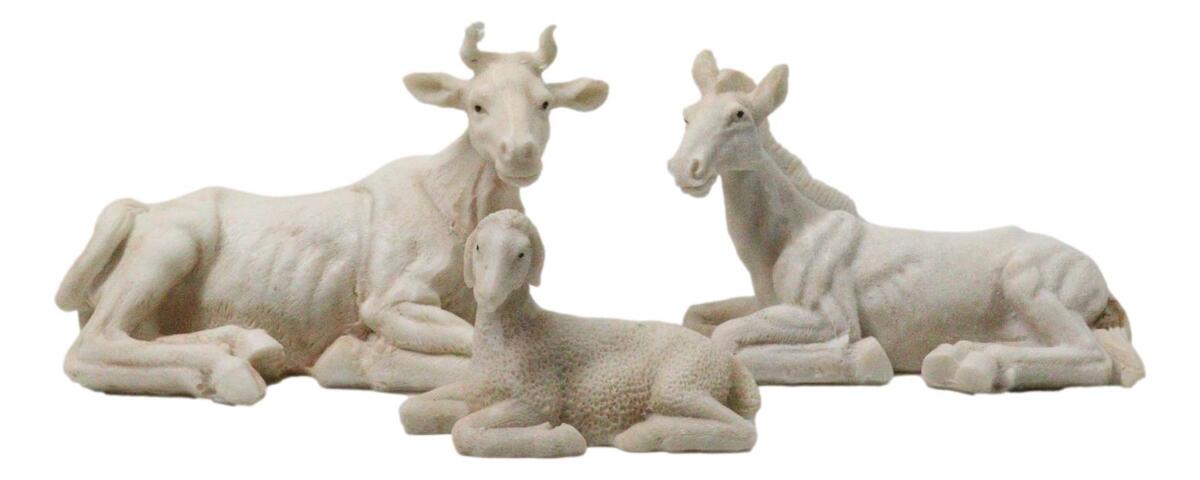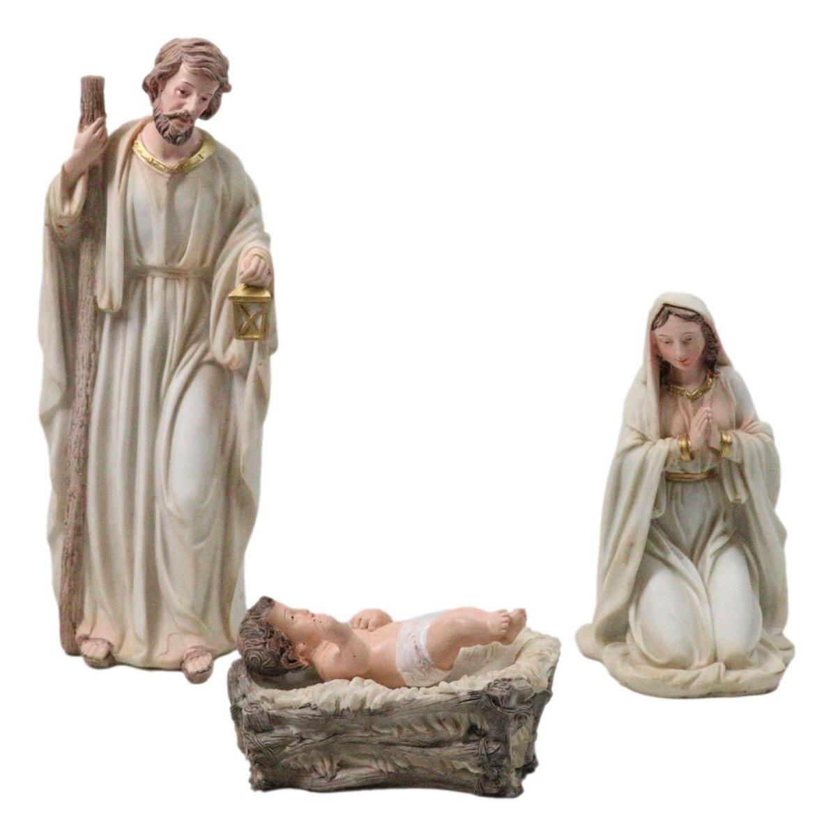 ? Depicting the auspicious nativity of Jesus this set is complete with Joseph, Mary and baby Jesus. This classic nativity set also includes the 3 Wise Men bearing gifts, Shepherd, 3 farm animals and an angel. The sculpture set totals 11 pieces.