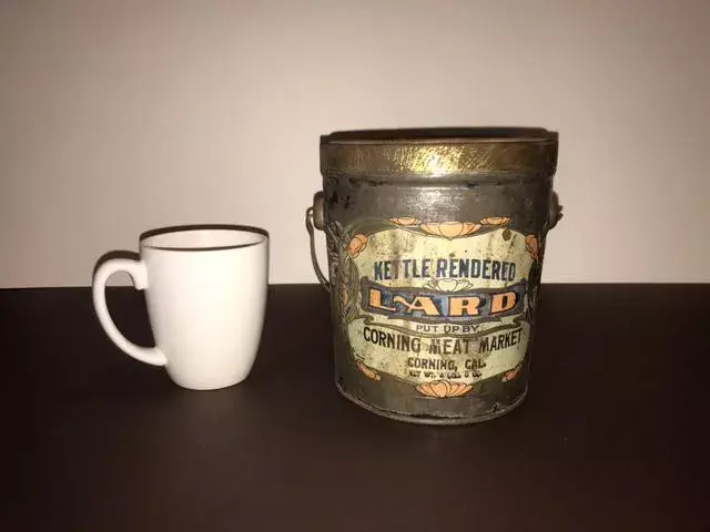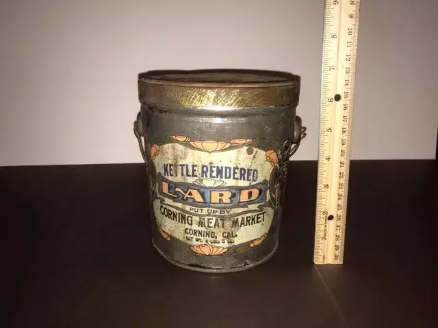 This listing offers a 4lb Kettle Rendered Lard Corning Meat Market tin. It's an uncommon tin from Corning CA from the 1940/50's in good condition.